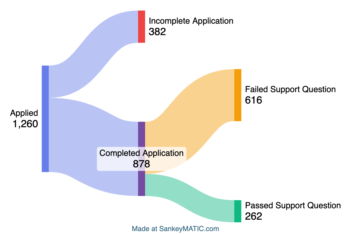 We got a ton of applicants, so I set up a script that would go through and check their application for two basic things — did they complete the application and did they get the support answer question correct.